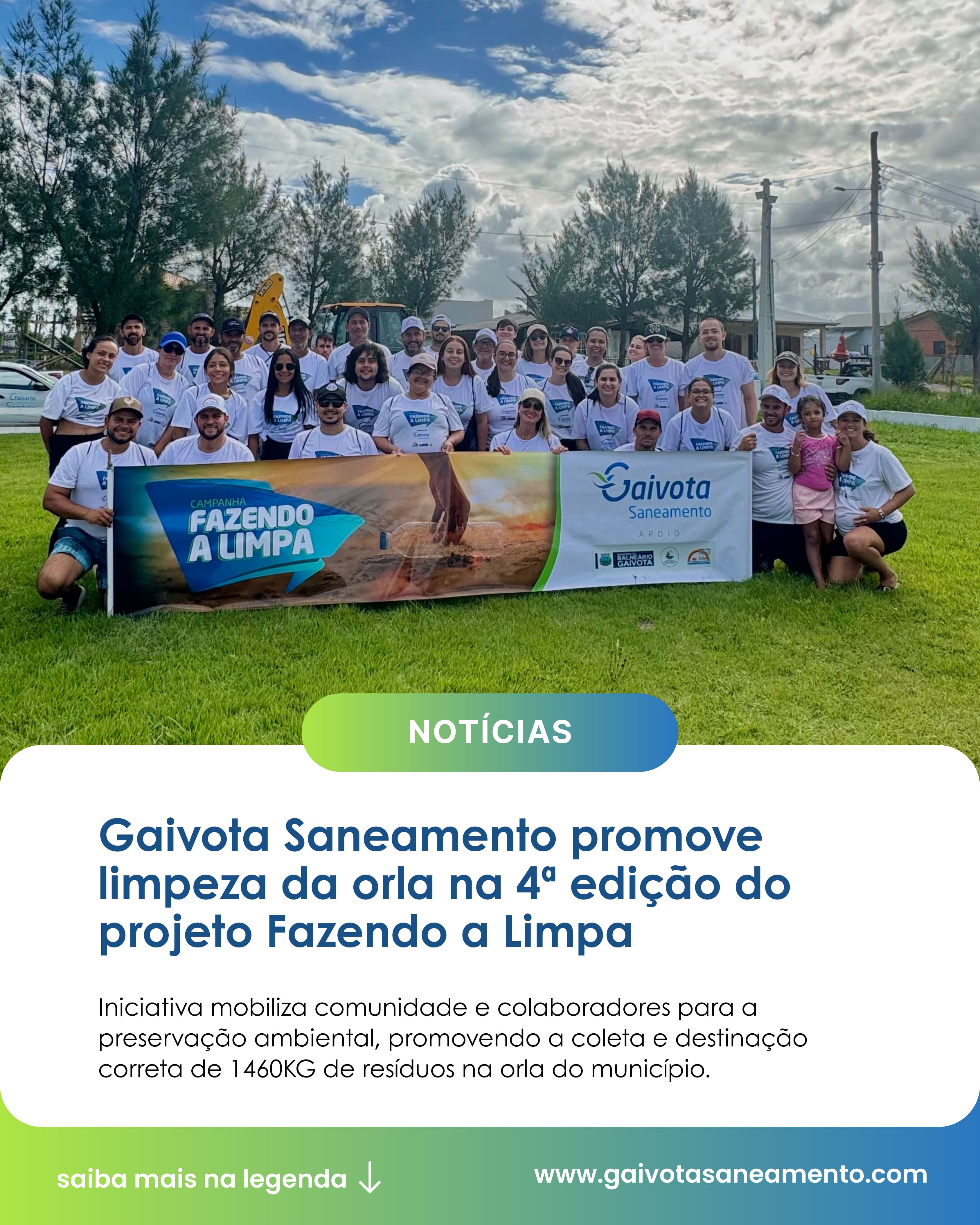 Ao final da ação, foram coletadas 1460KG de lixo, que tiveram destinação correta, contribuindo diretamente para a preservação do litoral e a qualidade de vida no município de Balneário Gaivota. O Fazendo a Limpa reforça o compromisso da Gaivota Saneamento com o cuidado ambiental e o engajamento comunitário, mostrando que a preservação dos espaços públicos é uma responsabilidade compartilhada.